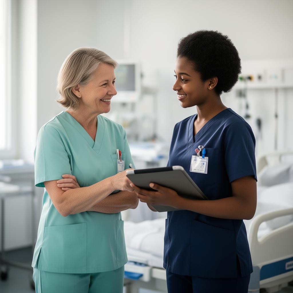 Kein klassischer Sprachkurs, sondern strukturierte Kommunikationsentwicklung direkt entlang von Übergabe, Dokumentation, Patient:innenkontakt und Teamarbeit — verbunden mit Onboarding und Anleitungsstrukturen Ihrer Einrichtung.